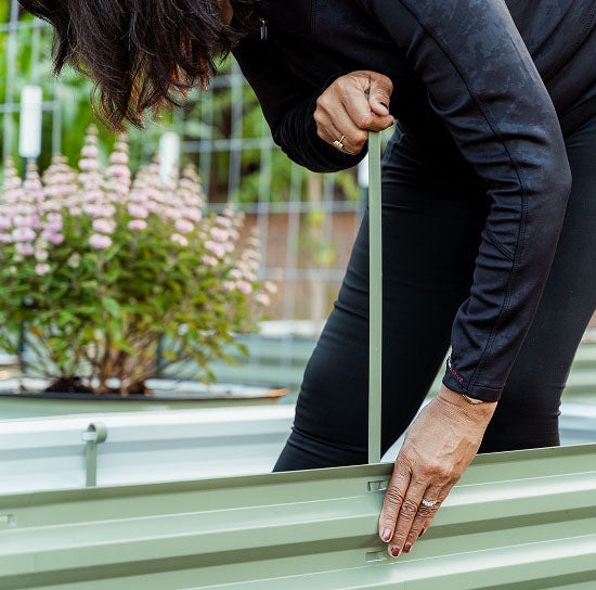 "Pop 'N Slide" technology is a phrase we coined to describe the unique, patented process in which our raised beds are assembled. The "pop" refers to the sound of the panels overlapping into position, and the "slide" refers to the stainless steel rod that slides down through the corrugated channels, locking two panels together securely. No tools, no hardware — just a satisfying click and slide.